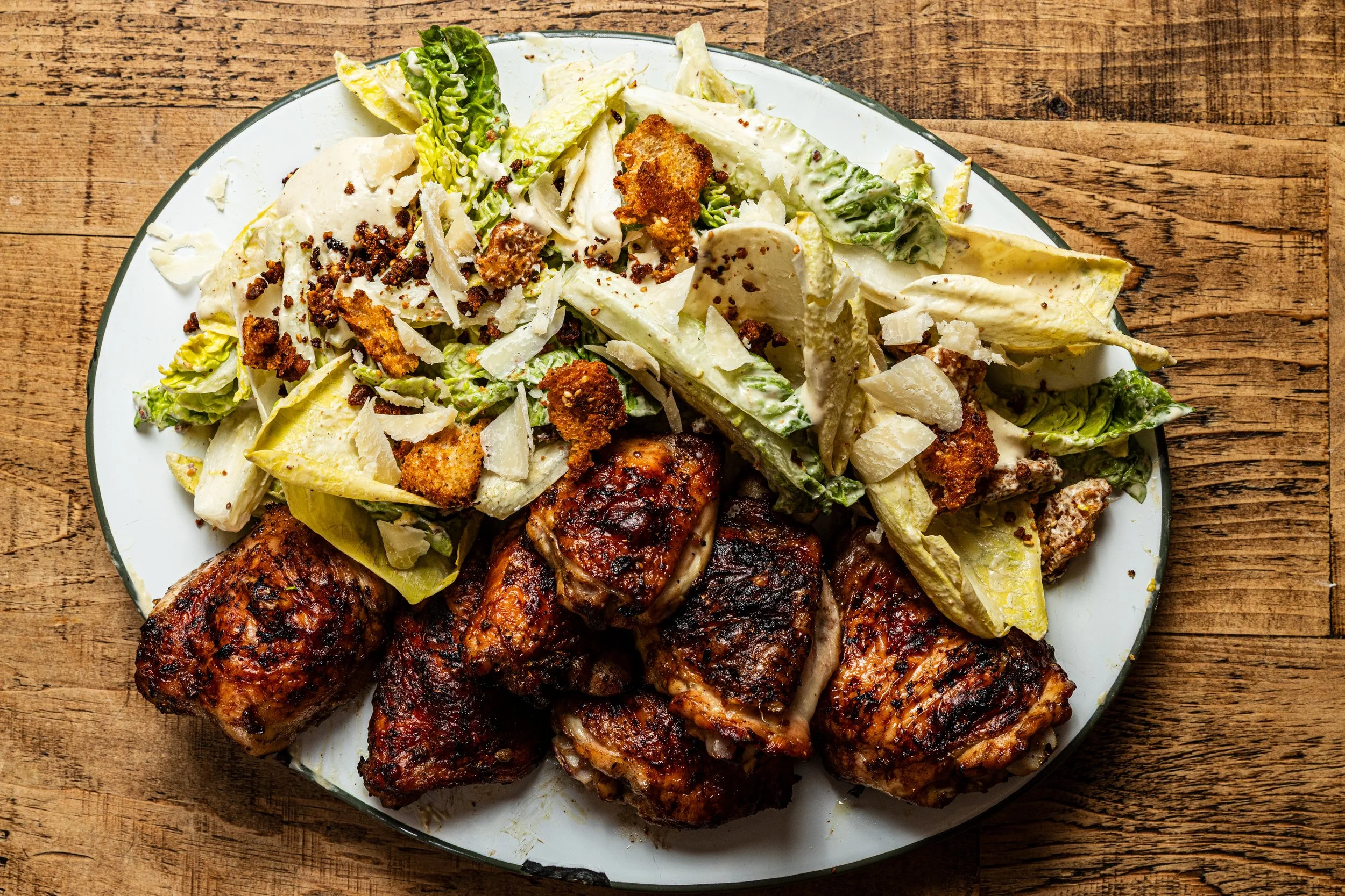 Loose garlic in the dressing gives you bite. Don’t turn it into a paste or you lose that edge.