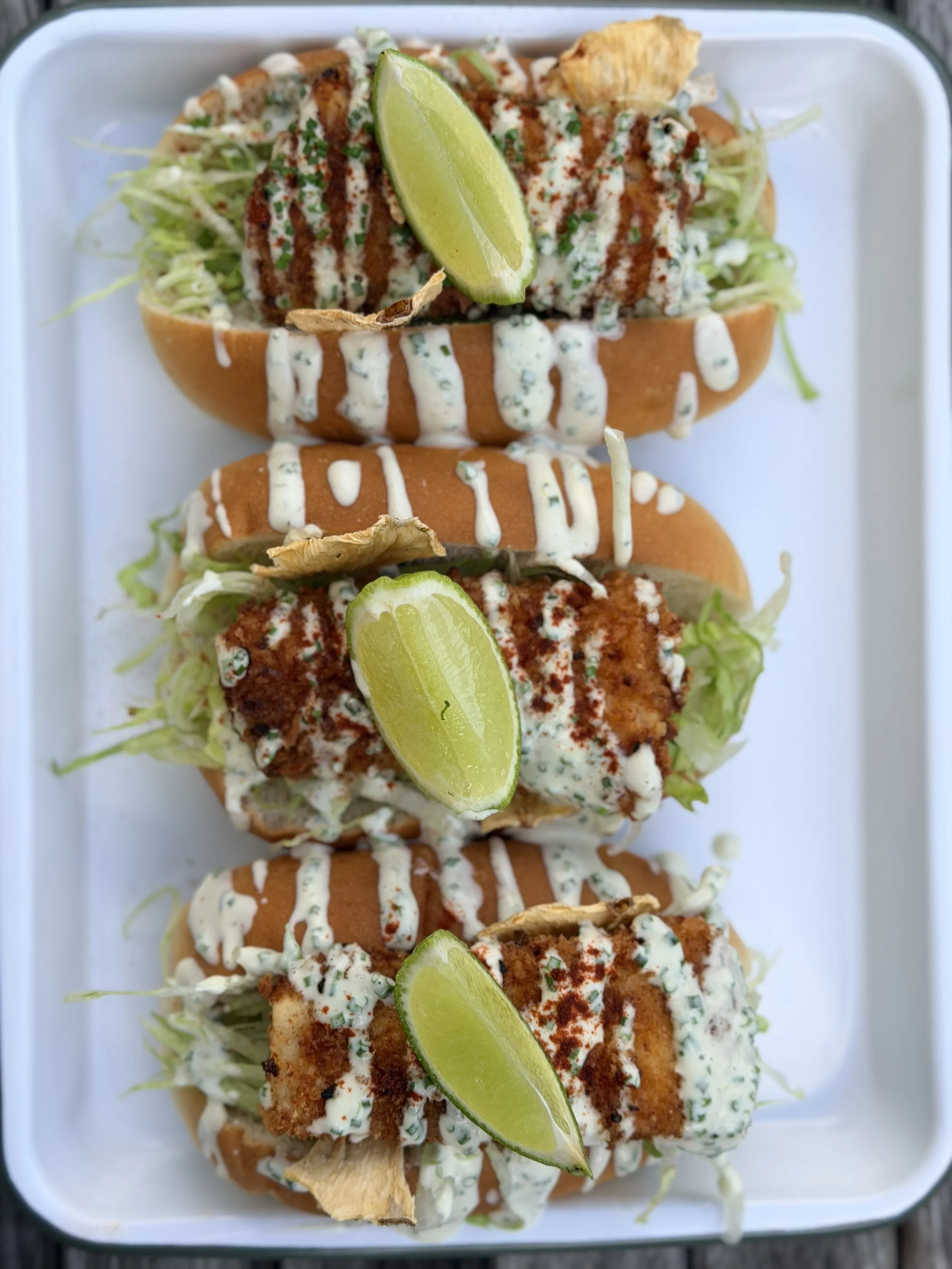 5. Warm the rolls slightly, add a layer of slaw, pile on the crispy fish, then squiggle a little extra BLAK ELDUR mayo over the top.