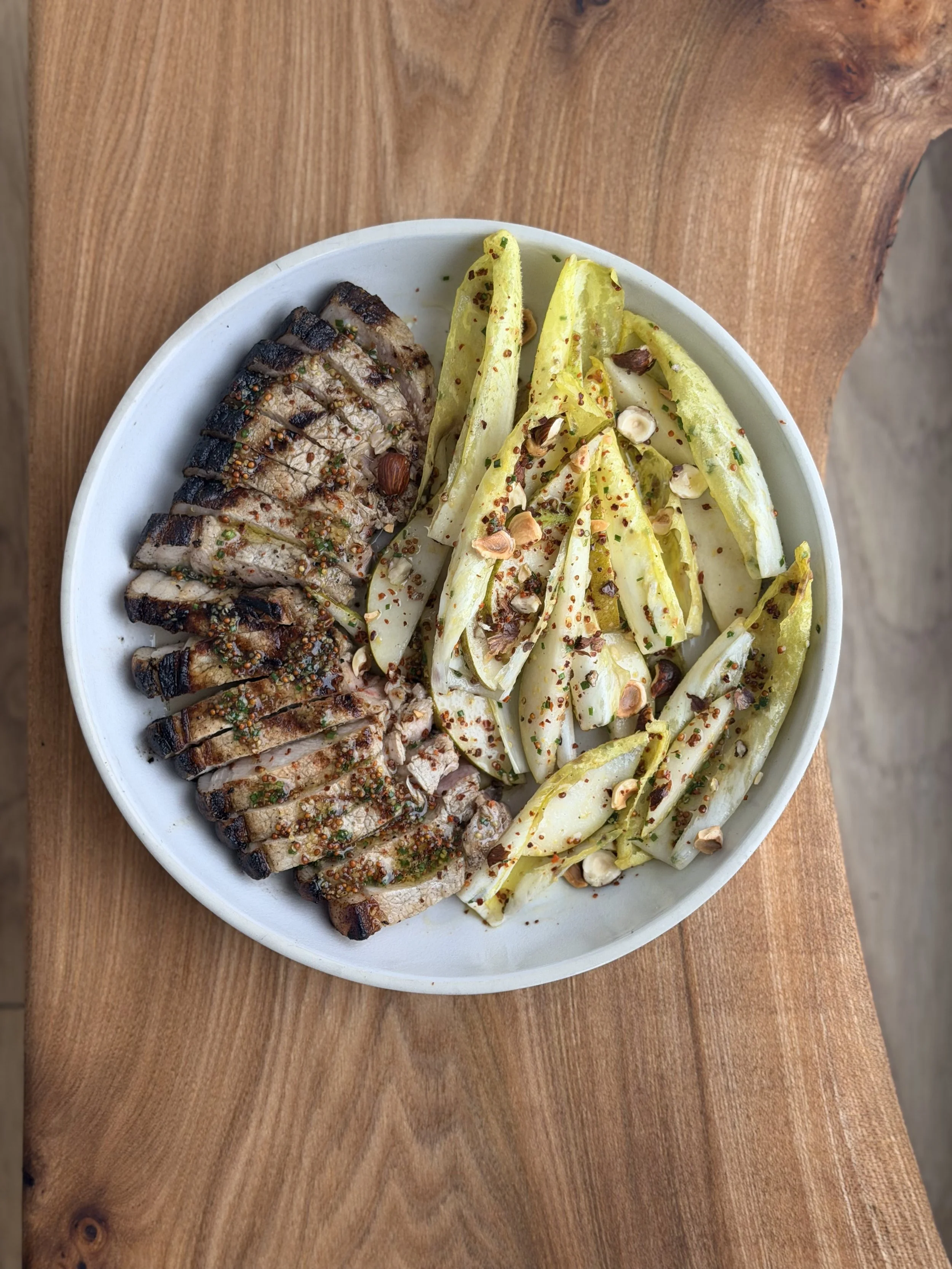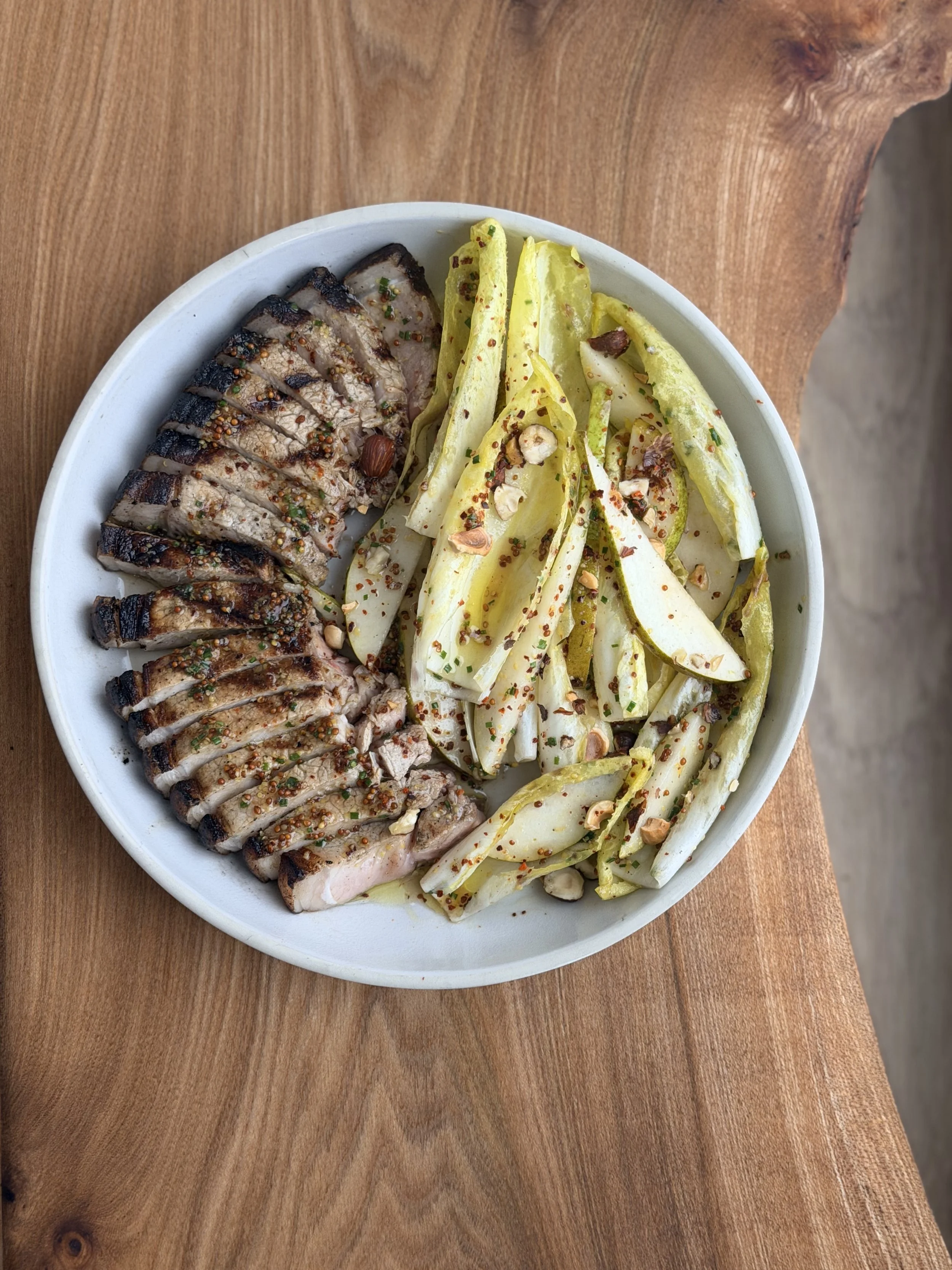 Pork Chop with pear, Chicory, Hazelnuts, Smoked Pineapple Vinegar Butter Dressing
